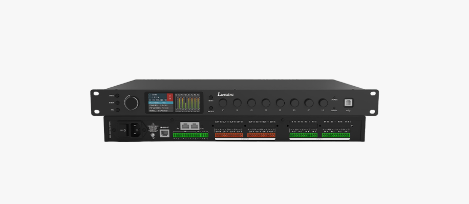 ◆ 面板带双2.0寸液晶显示屏。左屏支持配置设备名称、设备预设、设备IP、输入音量、输出音量、输入模式、设备版本查看等功能;右屏显示各输入输出通道电平跳动