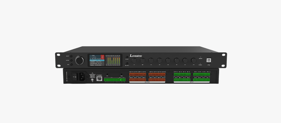 ◆ 面板带双2.0寸液晶显示屏。左屏支持配置设备名称、设备预设、设备IP、输入音量、输出音量、输入模式、设备版本查看等功能;右屏显示各输入输出通道电平跳动 ◆ 面板带旋钮,可单独控制输入输出各通道音量大小和静音