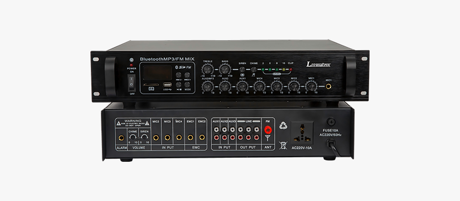 ◆ 可接消防短路信号,也可接无线遥控器信号,2个信号可以同时使用4路话筒信号输入,三路线路信号输入,二路紧急信号输入。◆ 6路线路信号输出,具有2级默音优先功能,话筒1为第一级优先,紧急输入信号为第二急优先,分路音量控制,高低音调节。◆ 有USB接口、FM收音、蓝牙接收、LED显示屏,带电源输出,可给功放供电,播放时电源自动打开,待机时自动关闭电源,可与消防对接,自带报警和机场提示音功能。