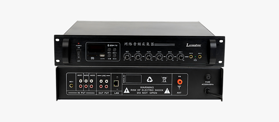 功能特点:◆ 机架式单音源、单通道IP网络音频编码终端机,可将本地的2路话筒2路,1路MP3模拟音源实时编码成数字化音频信号,实时传送到其它指定的任意一个、多个或全部终端;可实现自动采集功能,当有模拟音源进入采集器,采集器可自动打开软件采集功能,无线话筒讲话时无需跑机房操作。